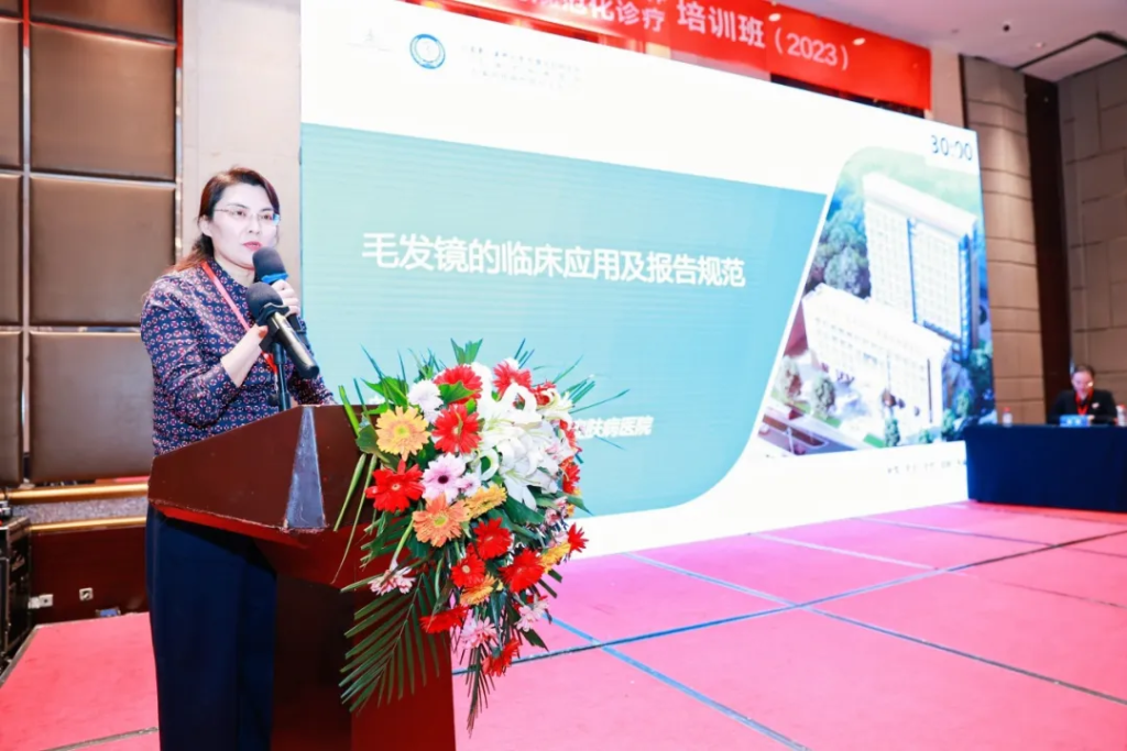 在下半场中,北京同仁医院魏爱华教授讲解了脱发疾病的非药物治疗;山东第一医科大学附属皮肤病医院刘国艳教授介绍了毛发镜检查规范与临床意义;济南市中心医院焦敬教授分享了综合性医院毛发专诊建设经验;临沂市人民医院熊瑛教授以“借助毛发门诊的建设,助力学科的发展”为题展开精彩演讲。以上全国知名毛发专家聚焦毛发专病建设,从不同角度进行高质量的授课,专家们的授课内容全面而丰富,为参会学者带来了一场学术盛宴,大会学术氛围浓厚,学员热情高涨,会场座无虚席。