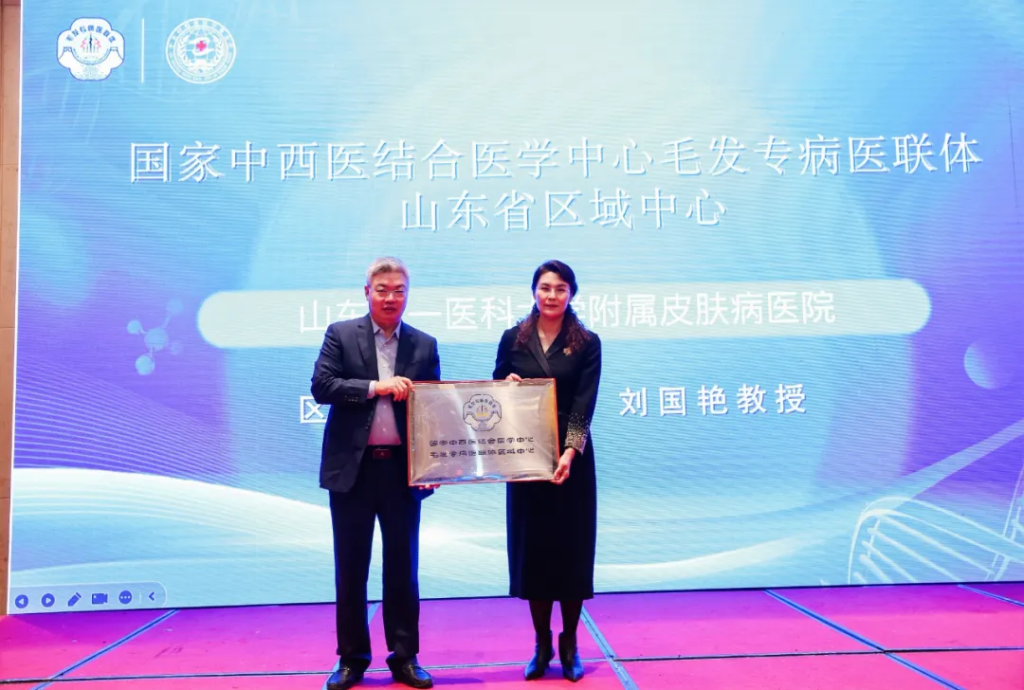 杨顶权教授为山东第一医科大学附属皮肤病医院刘国艳教授颁发“毛发专病医联体山东省区域中心”